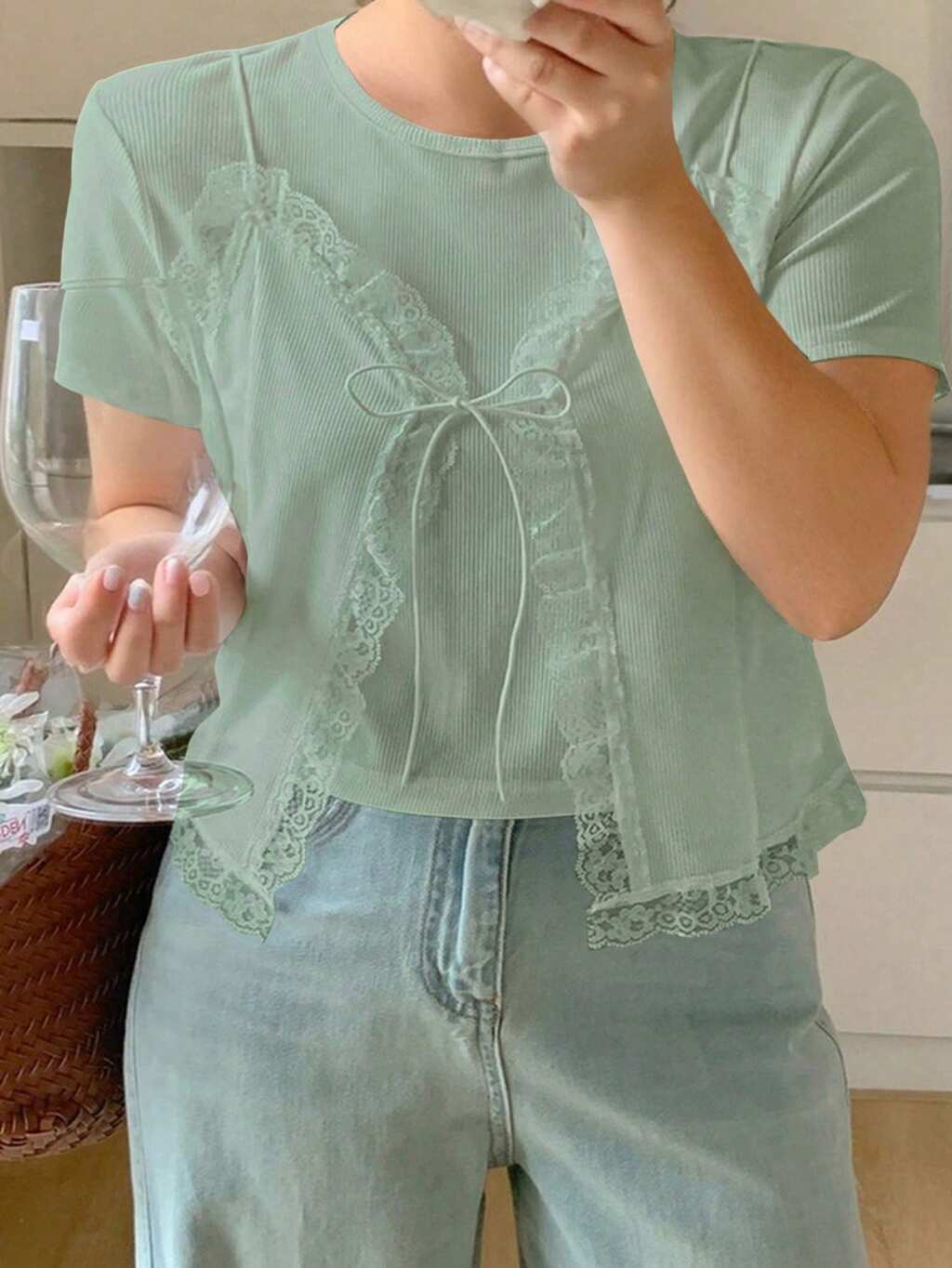 Dazy Plus Camiseta de mujer talla grande de verano con mangas cortas, contraste de encaje y detalle de lazo delantero en 2 en 1