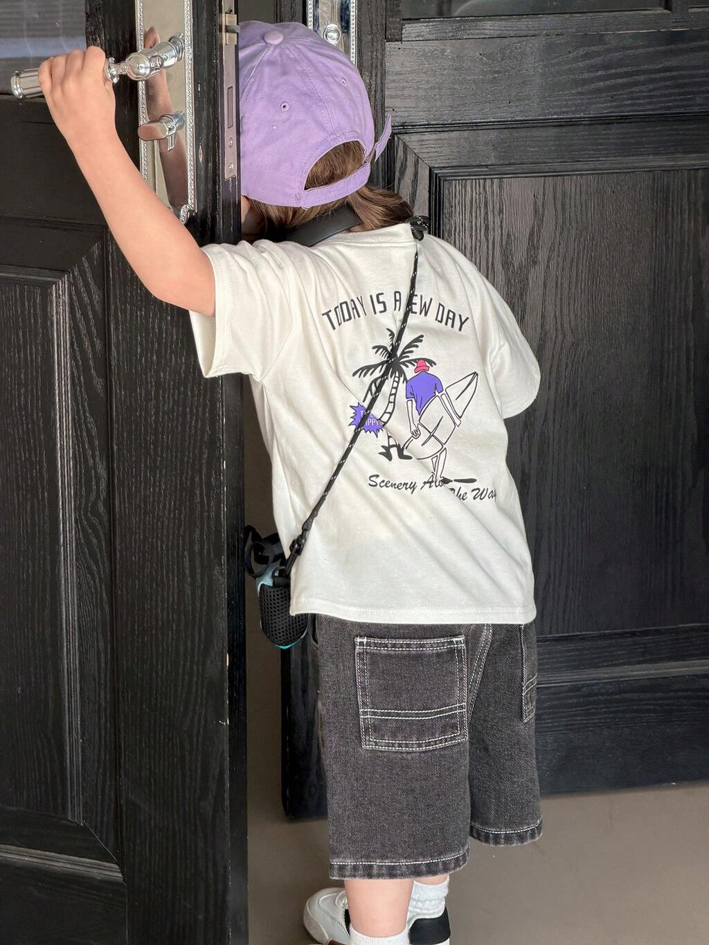 Camiseta de manga corta con cuello redondo y estampado de dibujos animados para niños pequeños, casual de verano