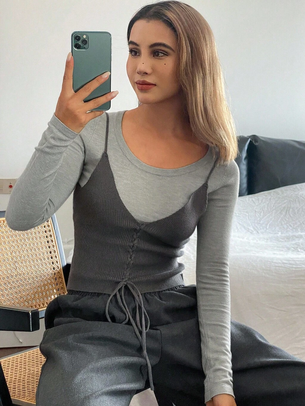 2 pièces/Set Femme Débardeur court ajusté noué en tricot & Pull à manches longues col rond, Tenue superposée pour l'automne/hiver