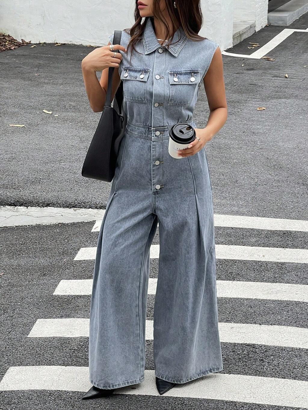 Combinaison en jean décontractée pour femmes avec col, poche et taille resserrée