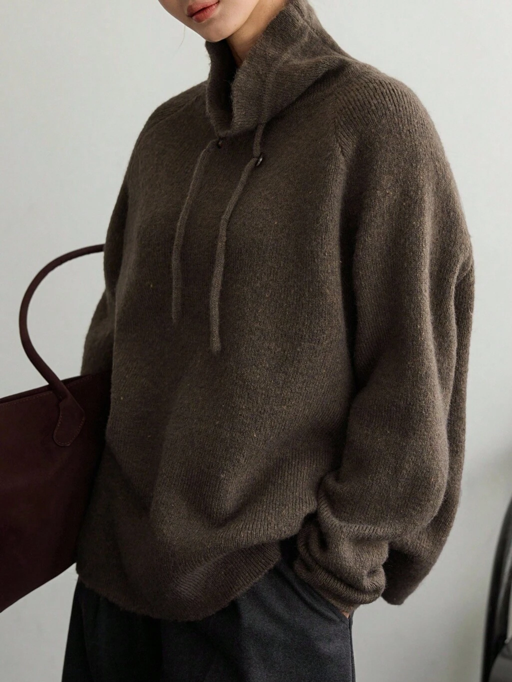 Pull tricoté minimaliste à col montant, couleur unie, style décontracté chic avec cordon de serrage, convient pour le port au bureau en automne et en hiver