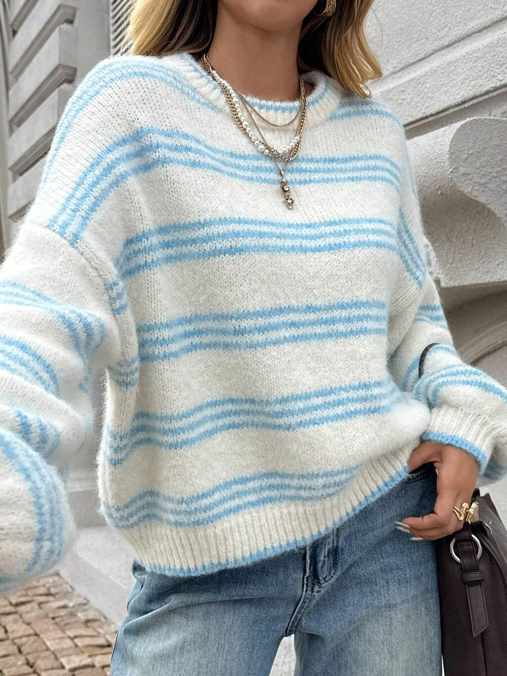 Pull col rond rayé bleu et blanc confortable et décontracté pour femmes, automne/hiver
