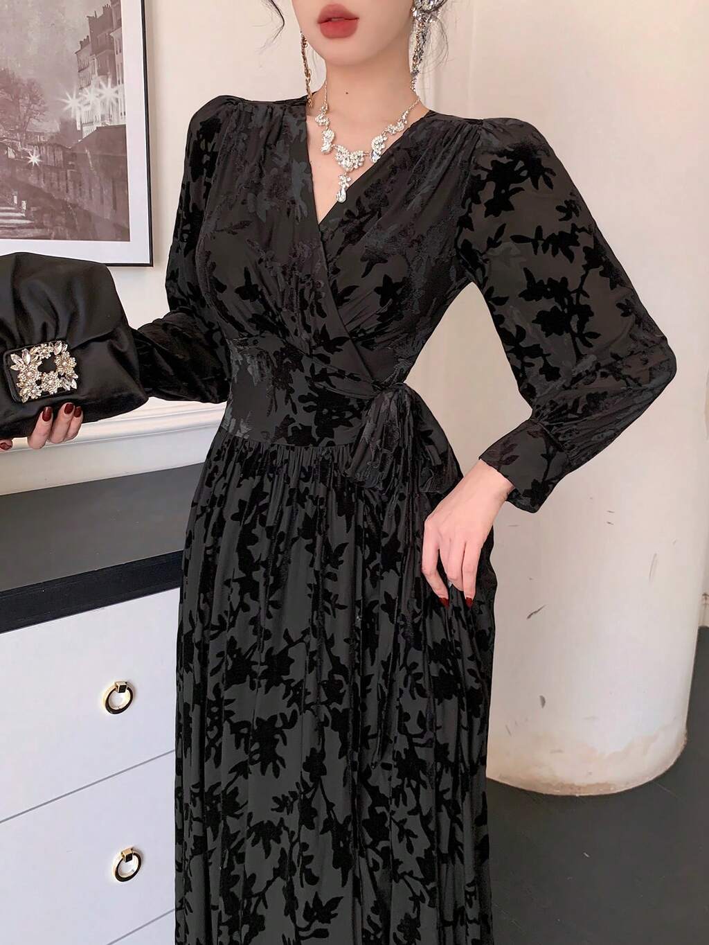 Robe longue élégante à manches longues, col en V, taille cintrée en tissu texturé pour femmes