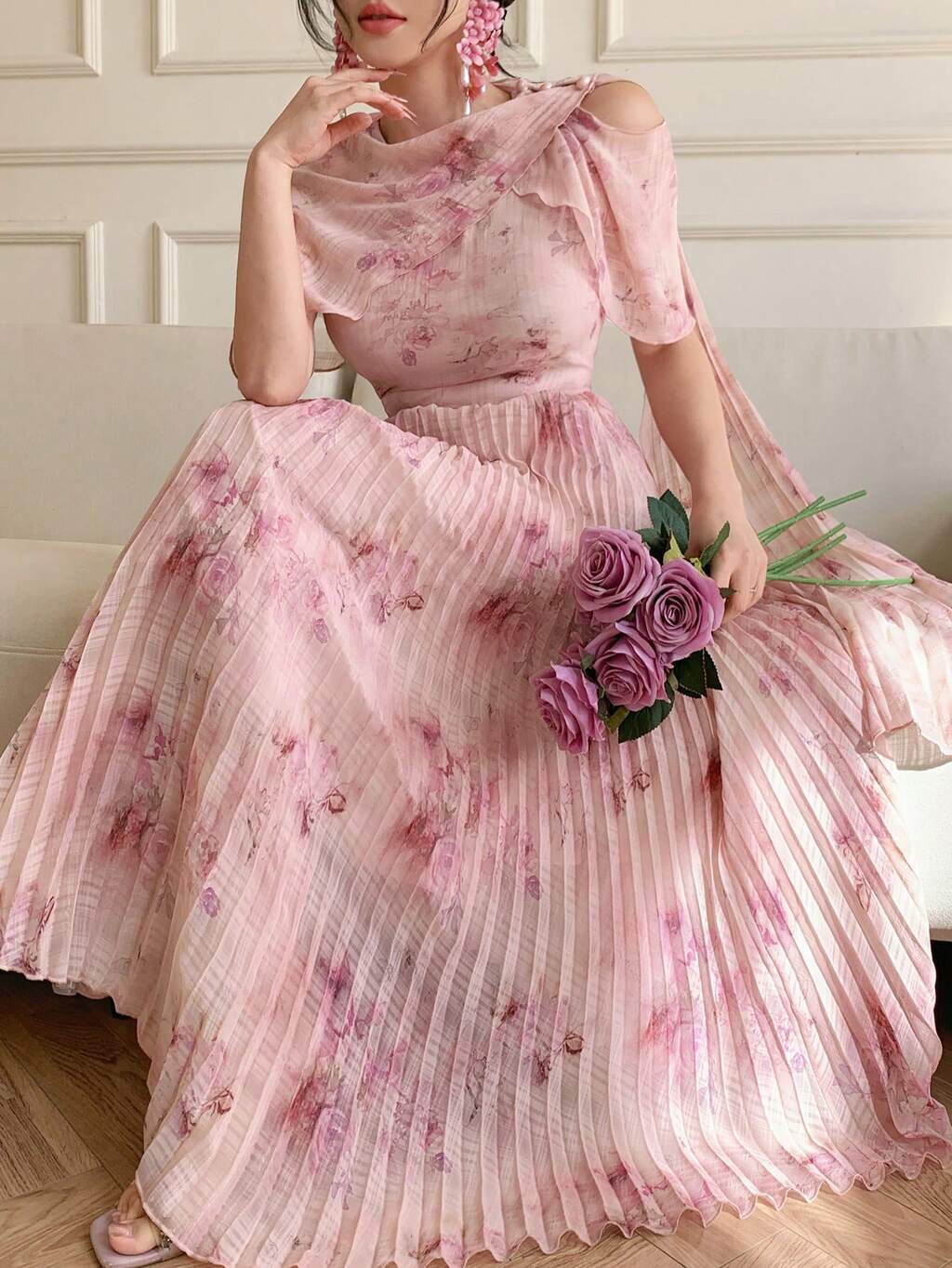 Robe longue plissée florale élégante pour femmes, robe de cocktail de mariage d'été, robe longue, robe d'été
