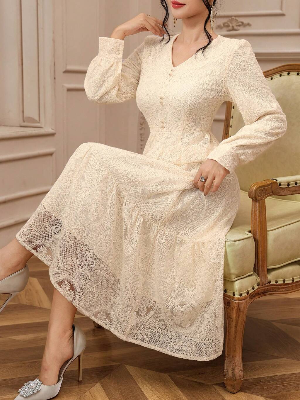 Robe longue en dentelle à manches longues, robe longue sophistiquée de style français Top de gamme pour femmes, robe d'été