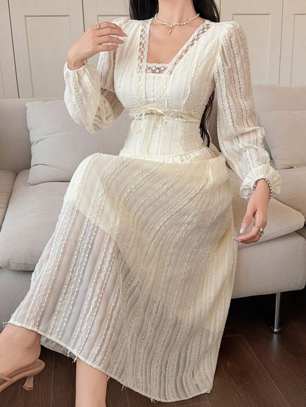Robe longue à manches longues avec encolure en V romantique et taille cintrée, robe d'été élégante et affinante