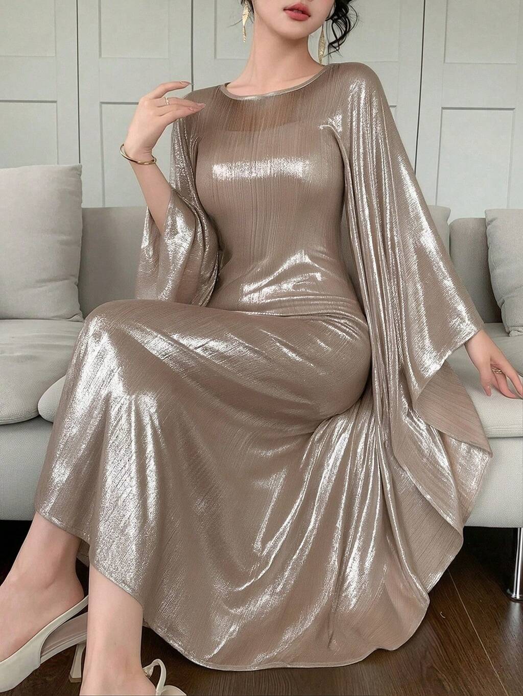 Robe de soirée dorée brillante pour le printemps/été, robe élégante à manches trompette pour mariage, fête, banquet, robe d'invitée de mariage
