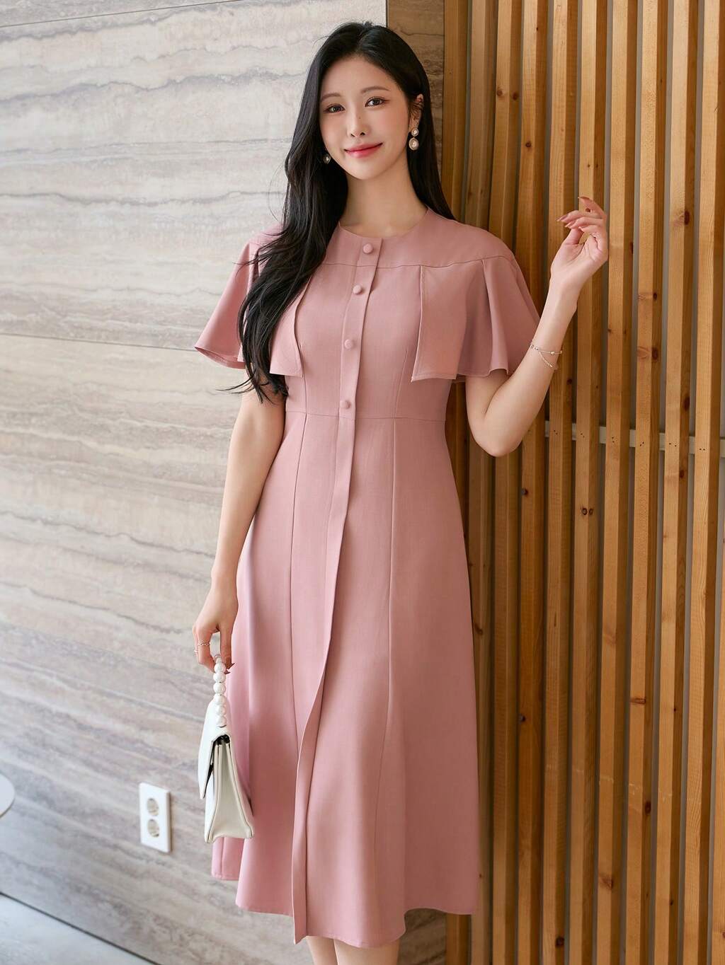 Robe élégante à manches évasées, taille cintrée et froncée, col rond, couleur unie pour femme