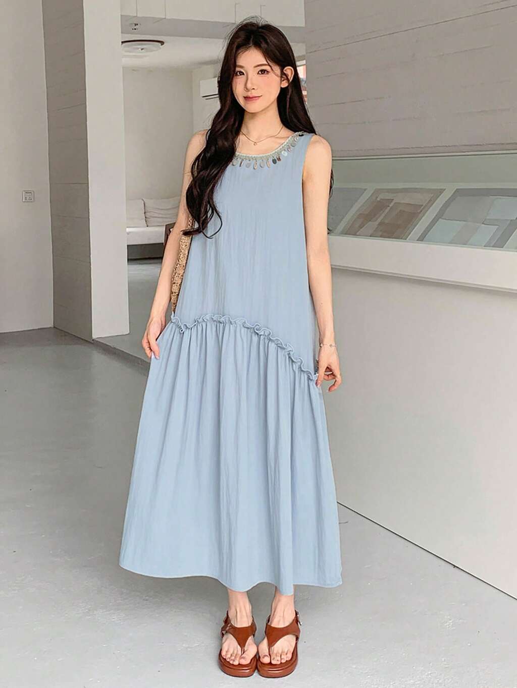 Robe décontractée sans manches avec volants de couleur unie pour femmes