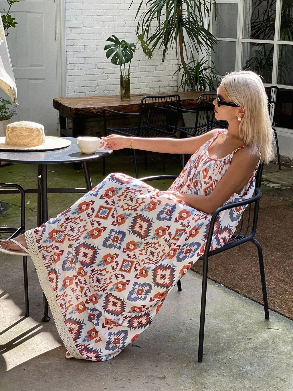 Robe mi-mollet à fines bretelles avec grand imprimé floral pour femmes, tenue de croisière pour printemps/été, volants