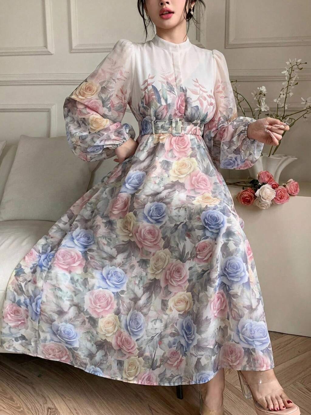 Nouvelle arrivée d'automne Robe élégante à manches bouffantes dégradées pour femmes, convient pour les sorties. Robe longue élégante à manches longues, robe maxi florale
