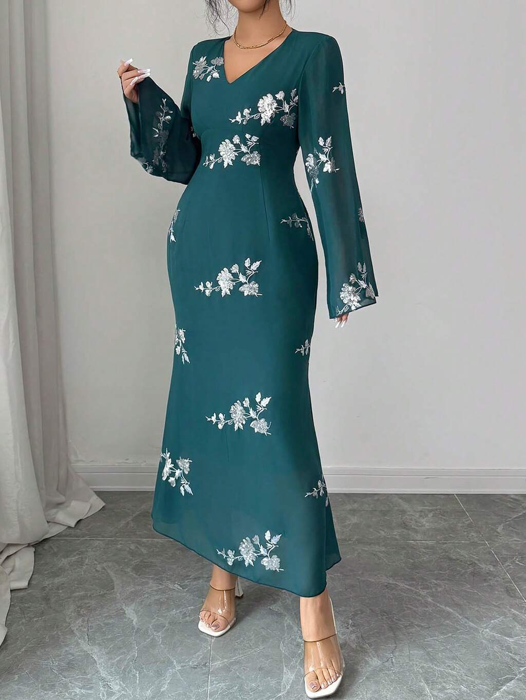 Robe longue élégante et ajustée pour femmes avec col montant, manches évasées et décolleté