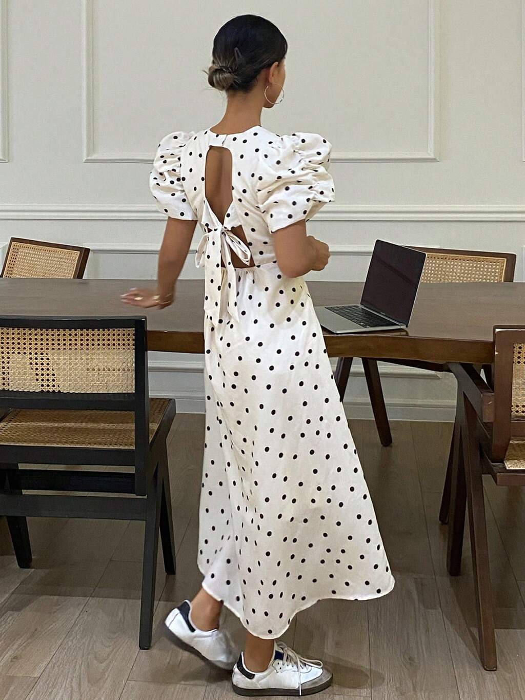 Robe d'été pour femmes à manches bouffantes à pois, dos nu avec nœud, style court et manches longues. Robe décontracté avec volants, robe longue pour femmes