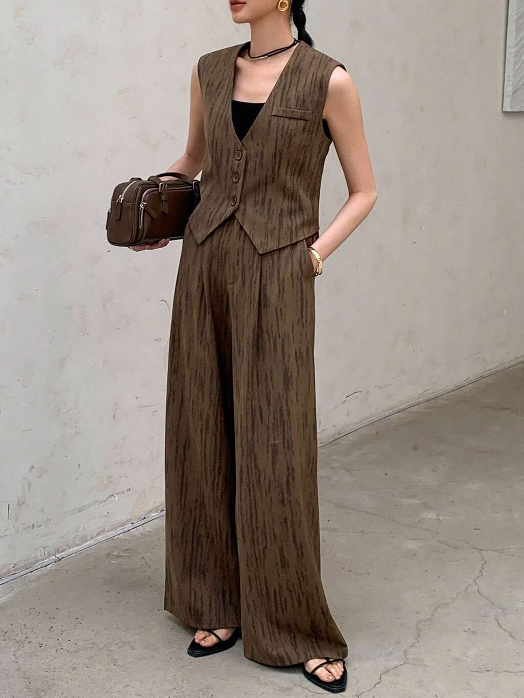 Ensemble 2 pièces décontracté pour femmes, composé d'un débardeur unicolore à simple boutonnage et d'un pantalon large