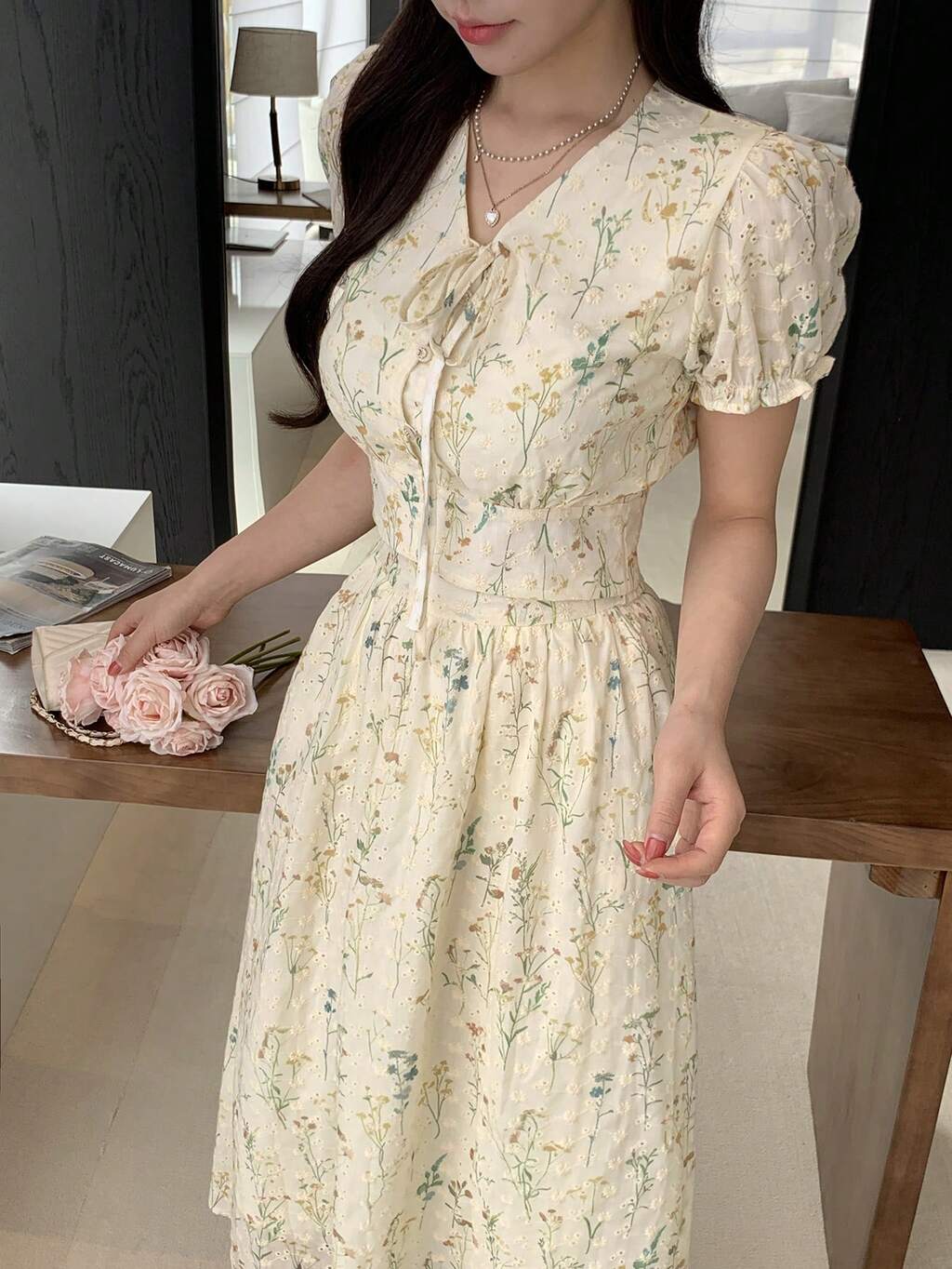 Ensemble 2 pièces blouse à manches bouffantes avec nœud devant et jupe, broderie florale, style bohème