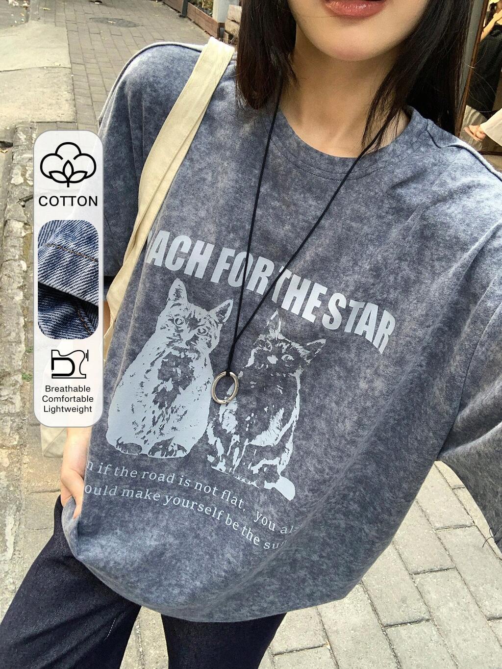 T-shirt ample à col rond avec imprimé slogan et dessin animé, épaules tombantes pour femmes