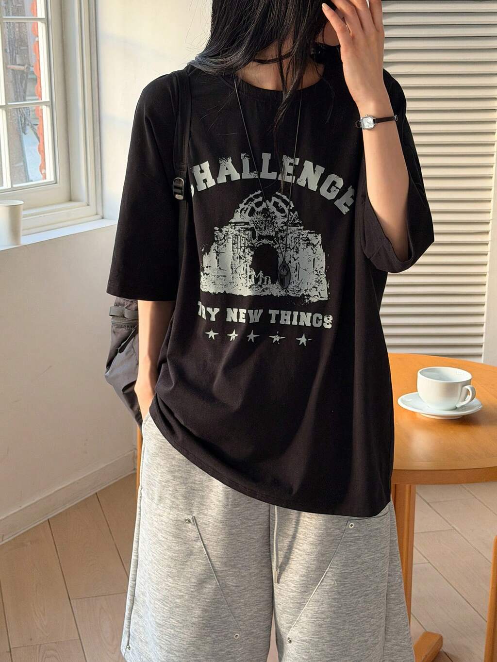 T-shirt à manches courtes avec imprimé de lettres anglaises col rond, style coréen oversize pour femmes