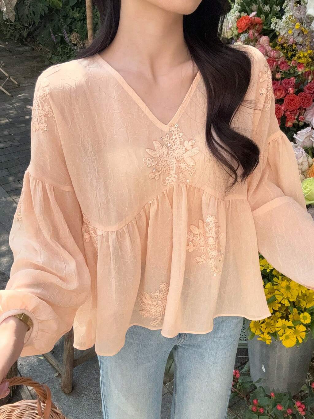 Chemisier à manches longues en organza et mousseline de soie avec décoration florale élégante et décontractée, ornements en dentelle au crochet et cordon de serrage. Vêtements d'été et d'automne pour femmes, tenue de travail décontractée