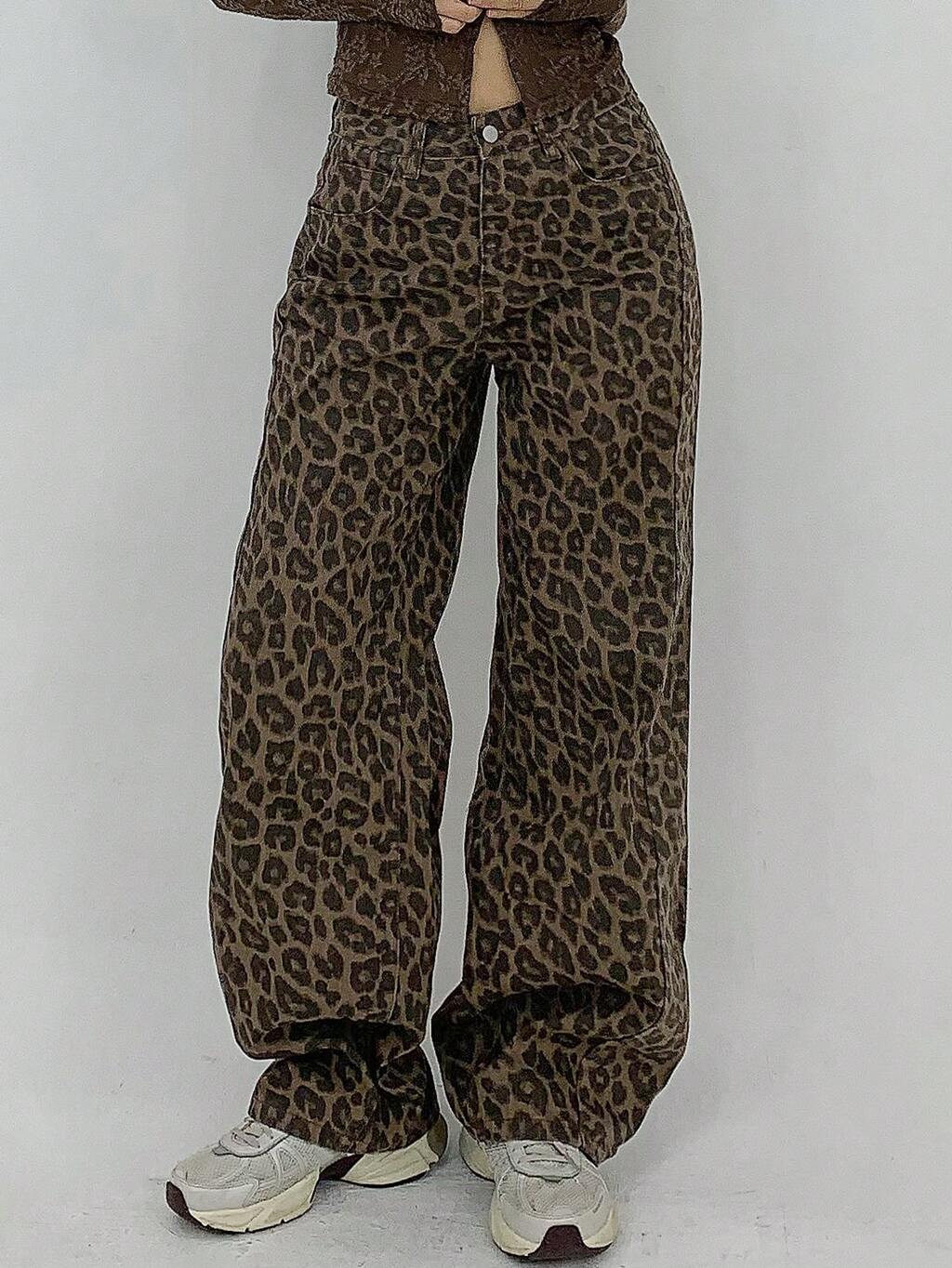 Jeans droits amples à imprimé léopard pour femmes