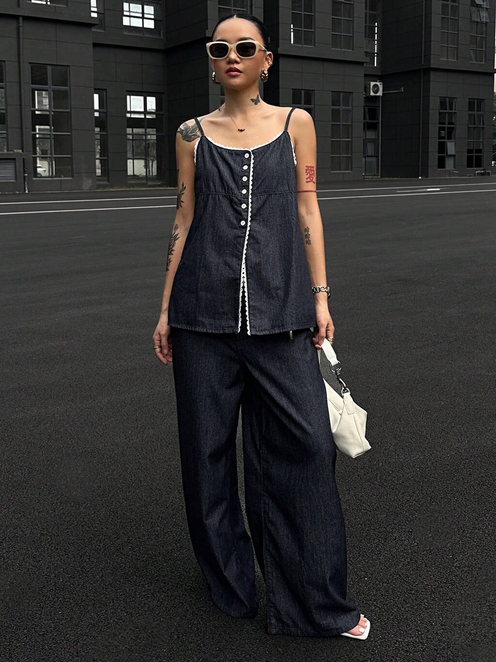 Ensemble 2 pièces en jean à la mode, haut sans manches et pantalon large, élégant et chic