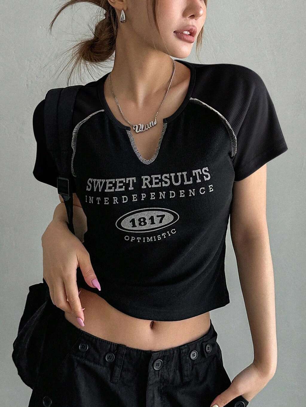 T-shirt à manches courtes slim fit pour femme de style sportif avec imprimé lettres et design de manches raglan Y2k