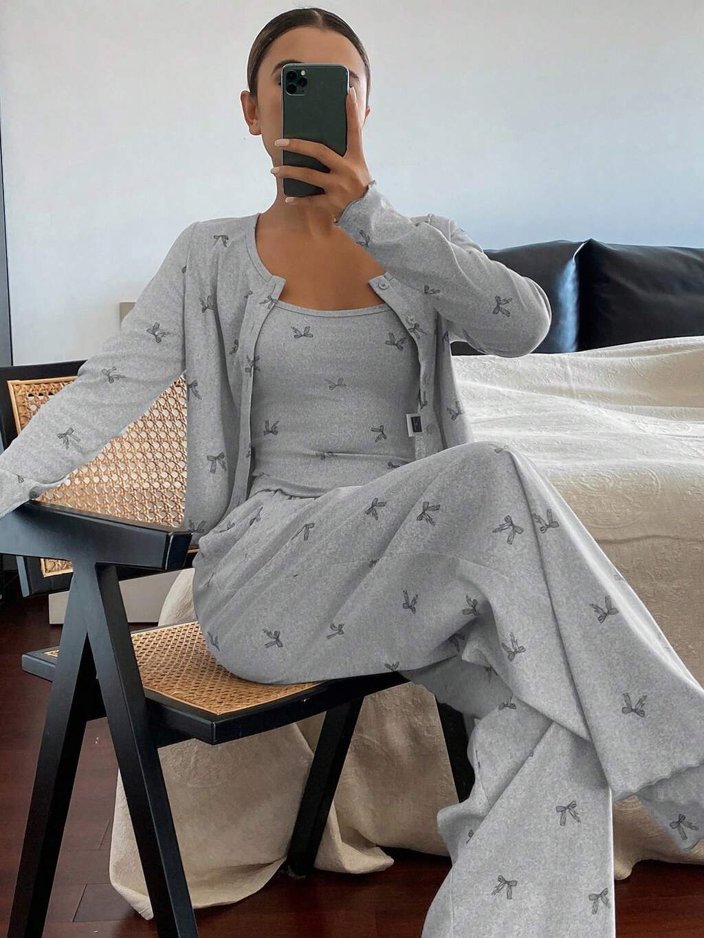 3 pièces Ensemble de pyjama femme avec cardigan, camisole et pantalon imprimés avec des nœuds, automne