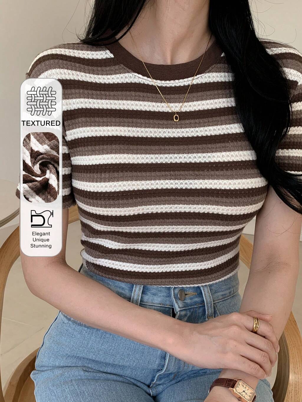 Top casual ajusté à manches courtes et col rond rayé pour femmes, style été "Old Money", à porter au quotidien