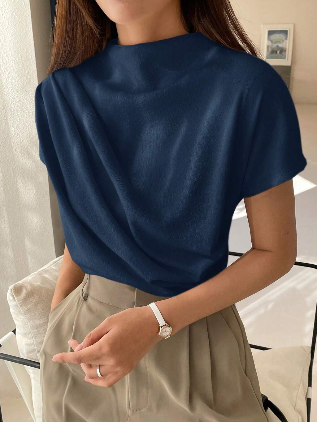 T-shirt d"été à manches courtes et col asymétrique plissé pour femmes minces