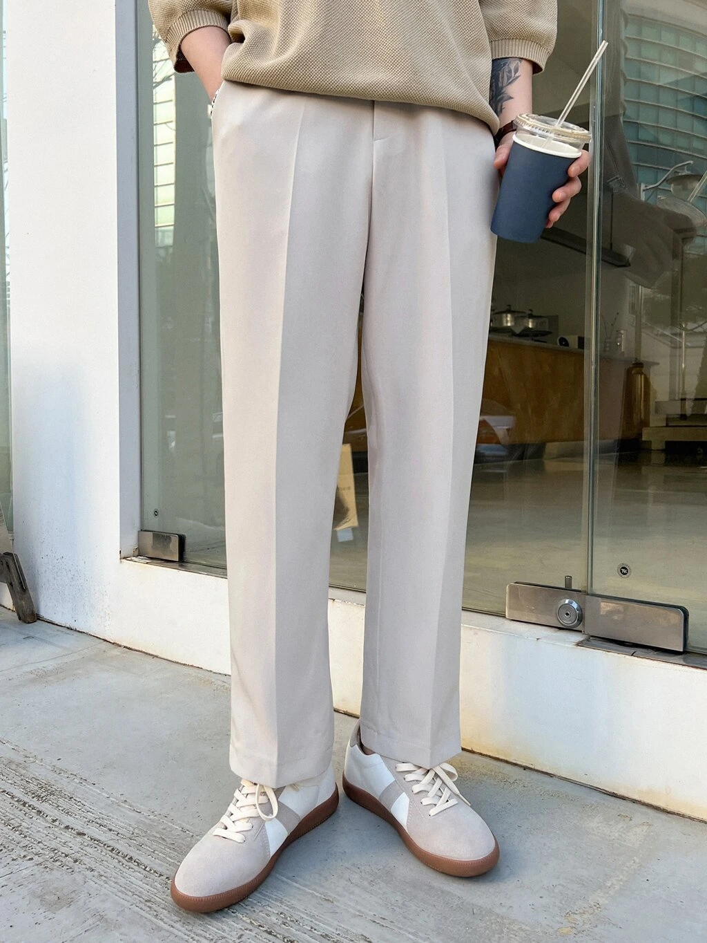 Pantaloni da tailleur dritti di colore beige tinta unita, adatti per l'ufficio, autunnali