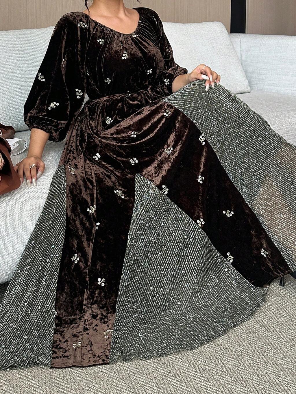 Dazy Plus Elegante abito in velluto con contrasto in rete e paillettes, abito lungo da festa oversize per donna