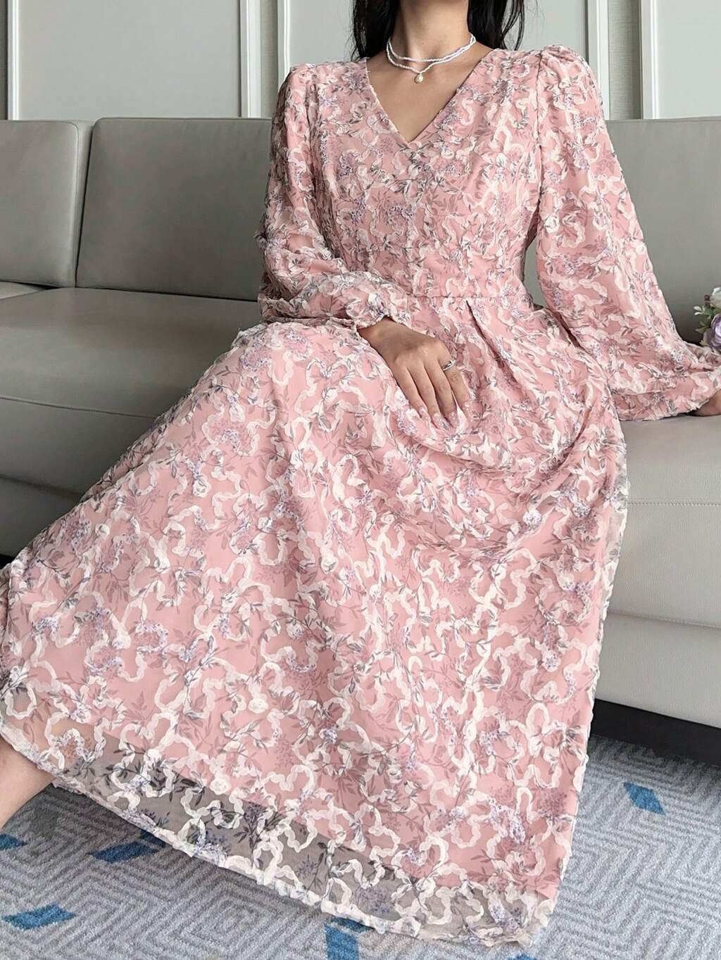 Dazy Plus Abito lungo in chiffon con stampa floreale, scollo a V, vita arricciata, vestibilità slim, maniche a lanterna, abito lungo con maniche lunghe adatto per l'autunno