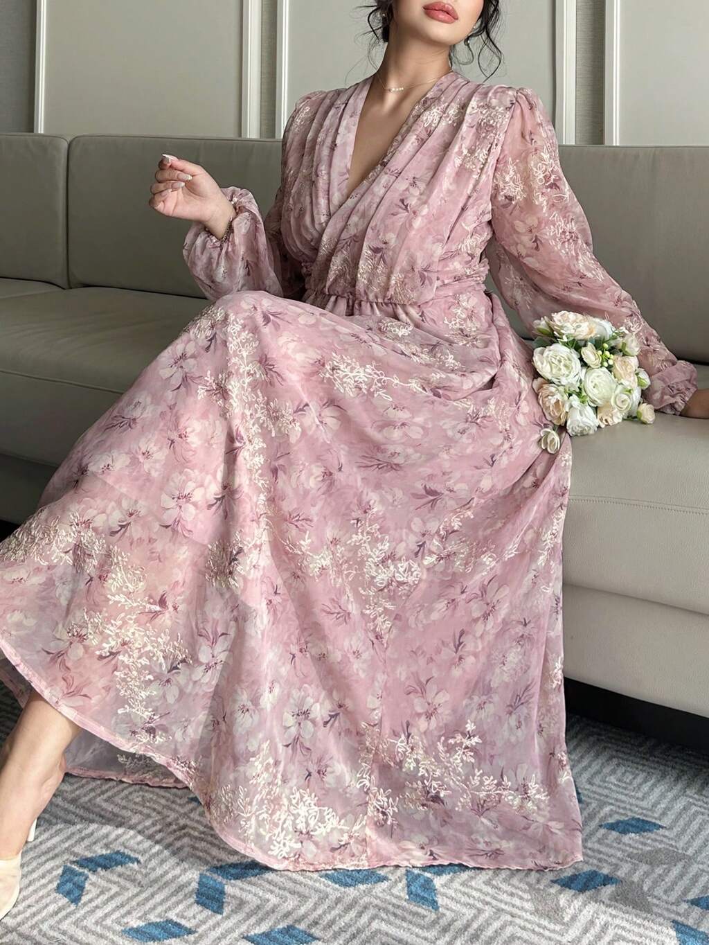Dazy Petite Plus Abito lungo con scollo a V, maniche lunghe, stampa floreale elegante, colore rosa anguria, decorazione con fiori tridimensionali, motivo floreale, vestito maxi per primavera/autunno, taglie comode