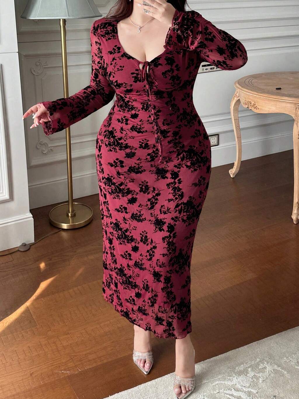 Dazy Plus Abito floreale con stampa floccata da donna taglie forti, vita con laccio elastico, sexy e aderente, adatto per feste, primavera/estate/autunno