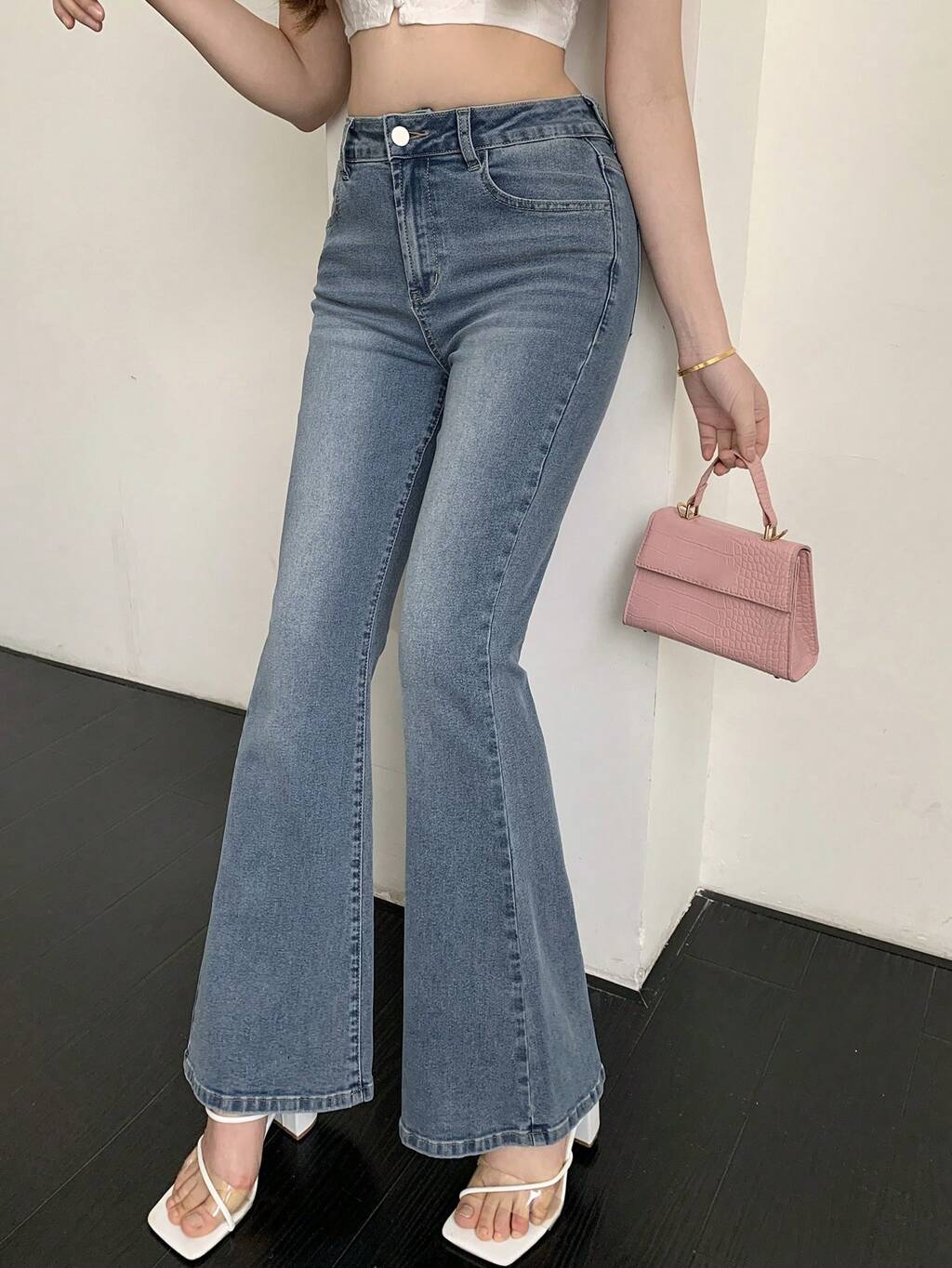 Jeans in denim lavato con ricamo a fiocco e effetto vissuto, stile coreano a zampa