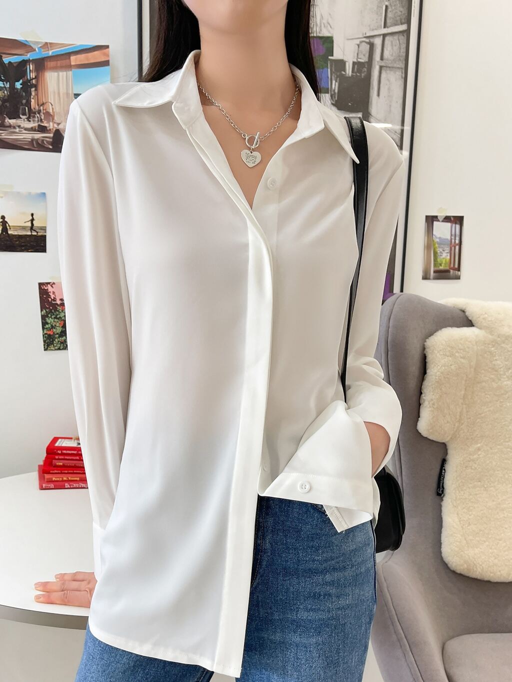 Blusa elegante di stile coreano con colletto, tinta unita