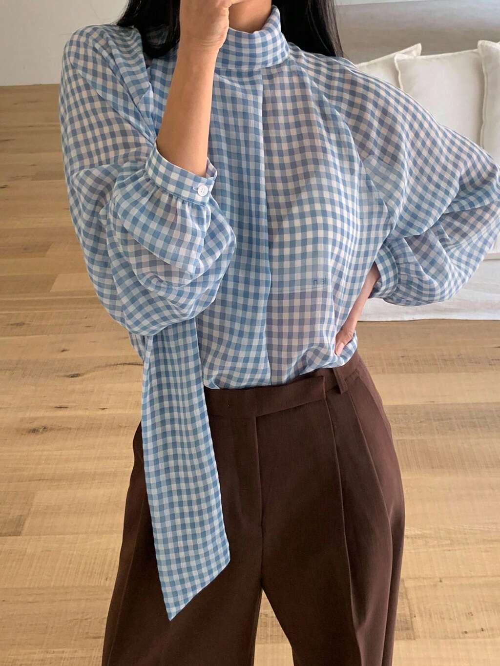 Camicia casual con colletto alla coreana, a quadri, ampia, da donna, con maniche lunghe, adatta per l'autunno
