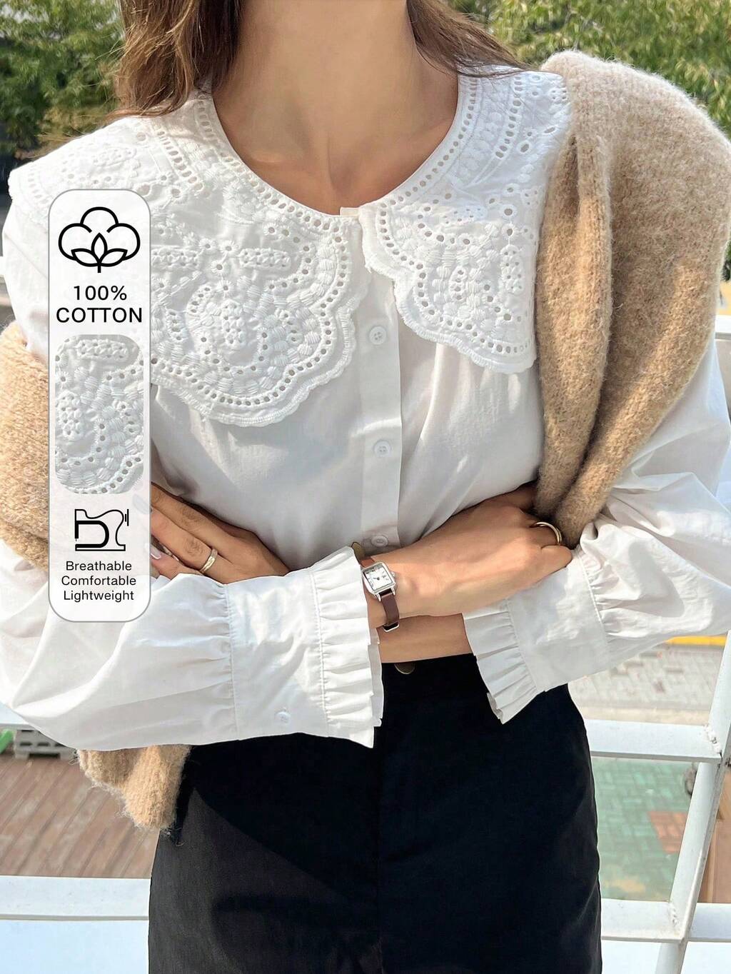 Camicetta da donna con maniche lunghe, colore unito, decorata con pizzo traforato, adatta per uscire