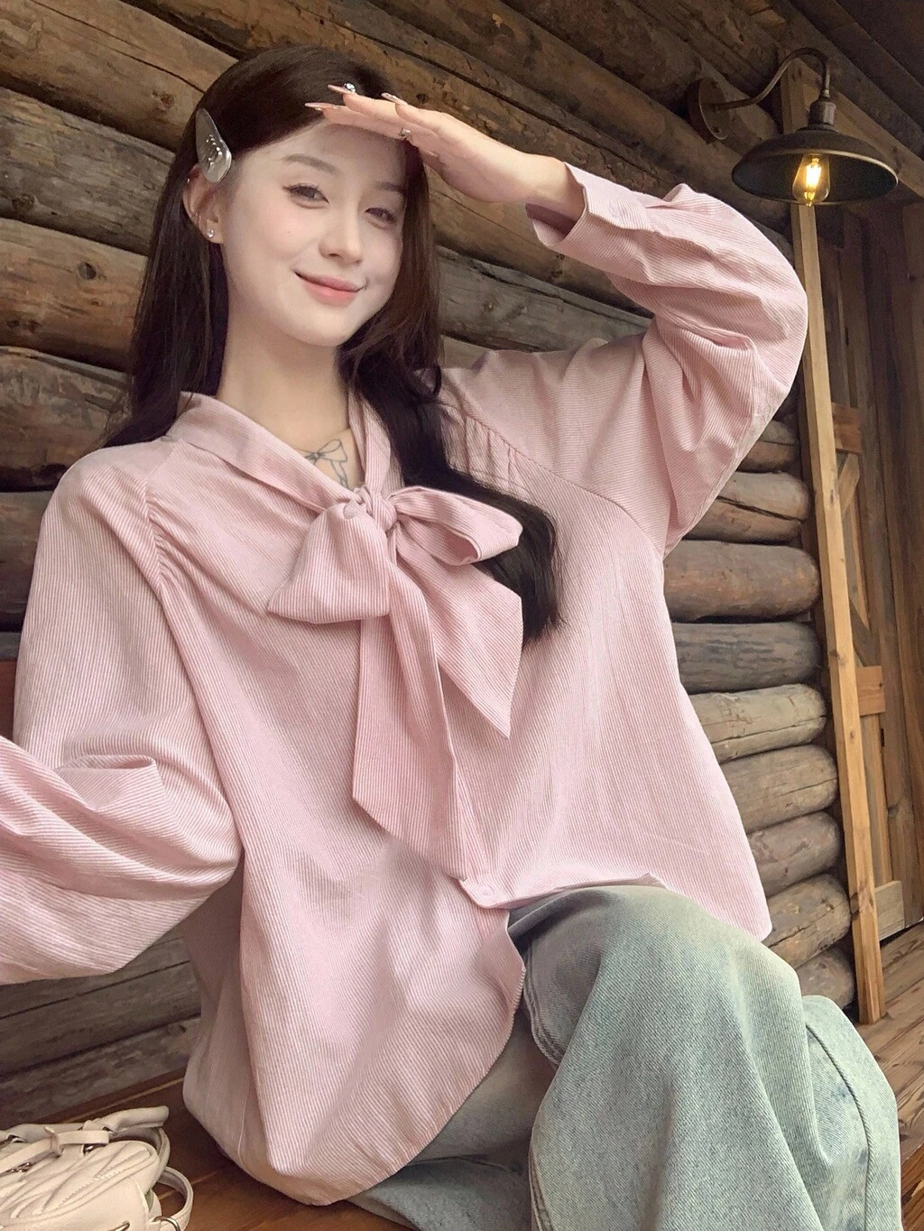 Camicetta a maniche lunghe con righe e fiocco in stile coreano, adatta per primavera/autunno