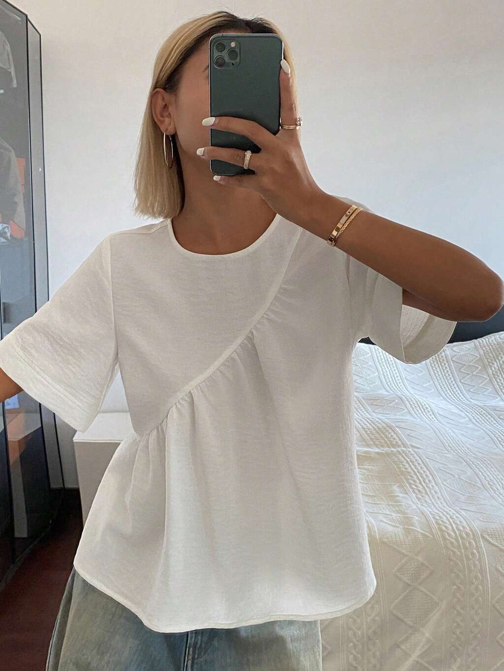 Blusa donna a maniche corte con colletto asimmetrico drappeggiato, di colore unito, stile minimalista, adatta per l'ufficio e il casual
