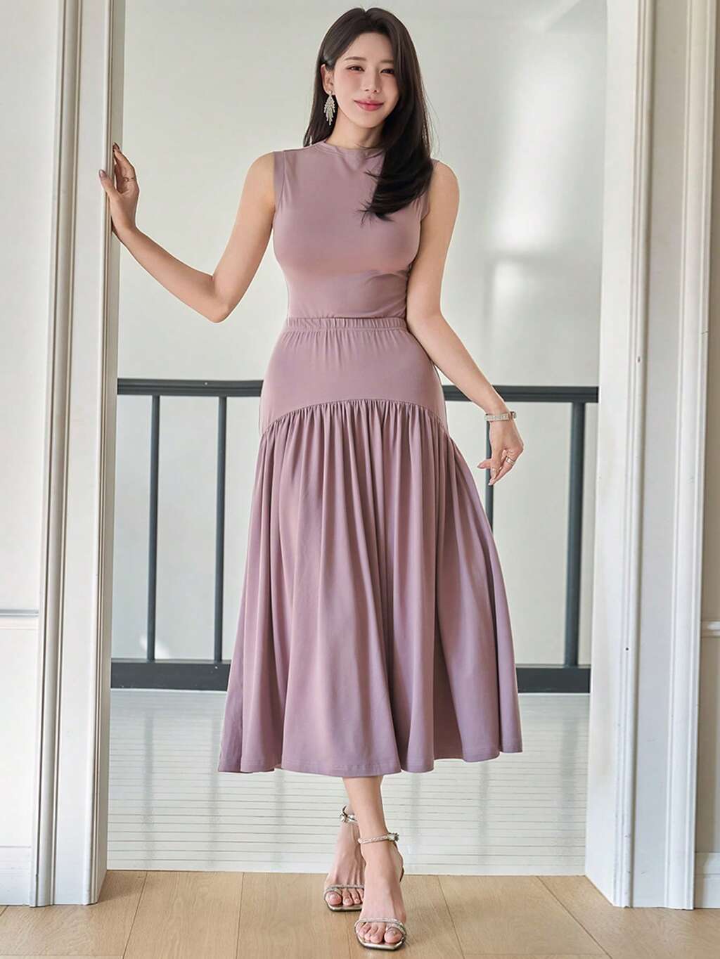Set elegante da donna a 2 pezzi, composto da canotta con colletto alla coreana e gonna plissettata, in colore unito, adatto per l'estate