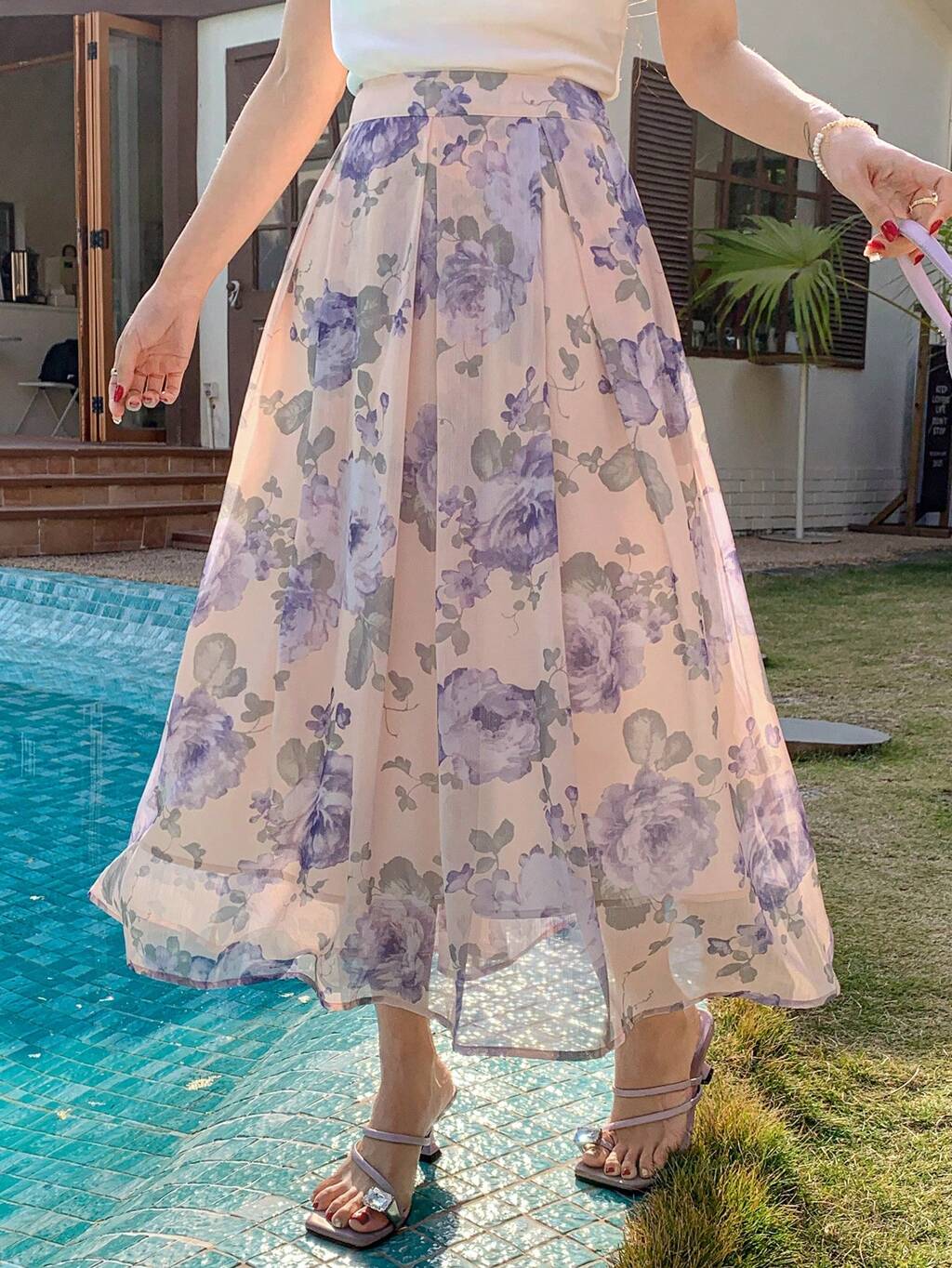 Gonna a-line da donna con stampa floreale all-over, casual e alla moda, adatta per l'uso quotidiano e per la Pasqua