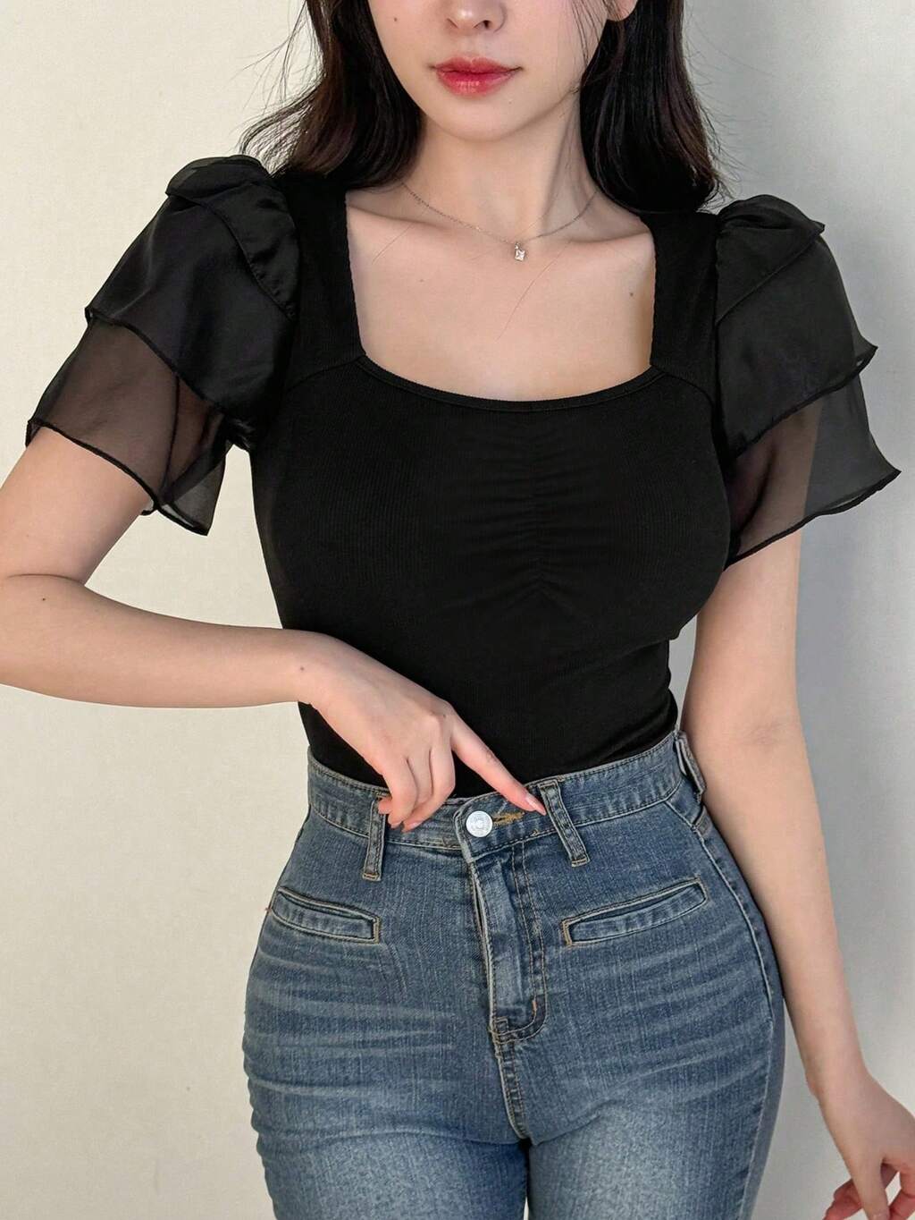 Maglietta donna con scollo quadrato e maniche corte a volant, crop top donna