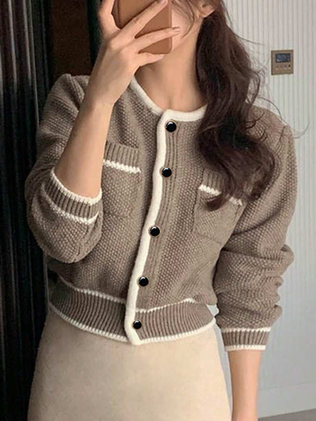 Cardigan corto a maniche lunghe con collo rotondo, abbottonato, monocromatico, in vita alta, versatile per le donne