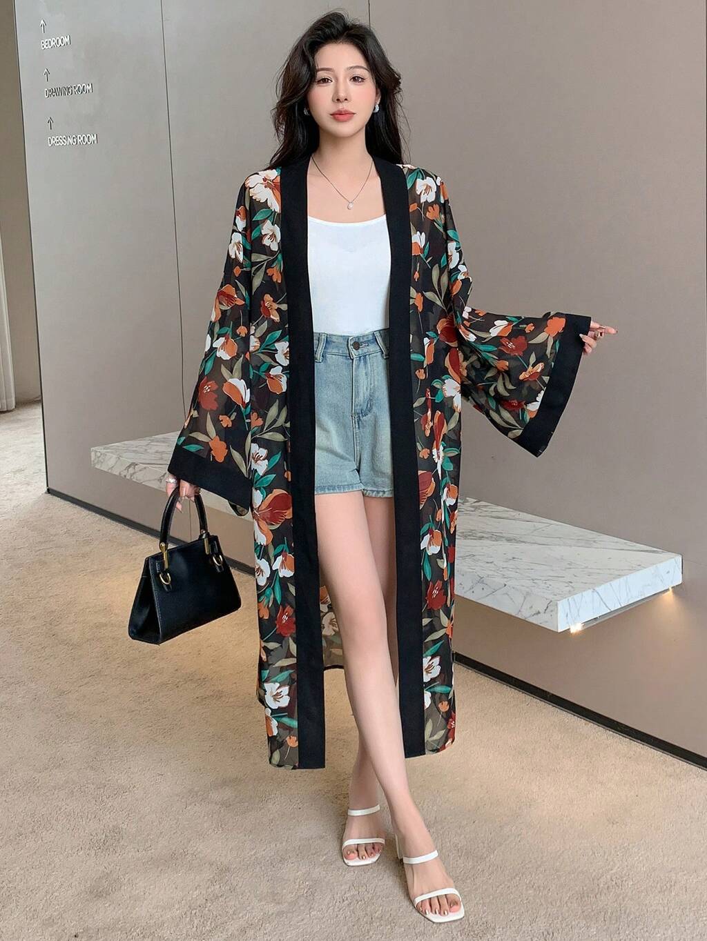 Kimono copricostume con stampa floreale e maniche a campana, ideale per vacanze estive e spiaggia, outfit da donna