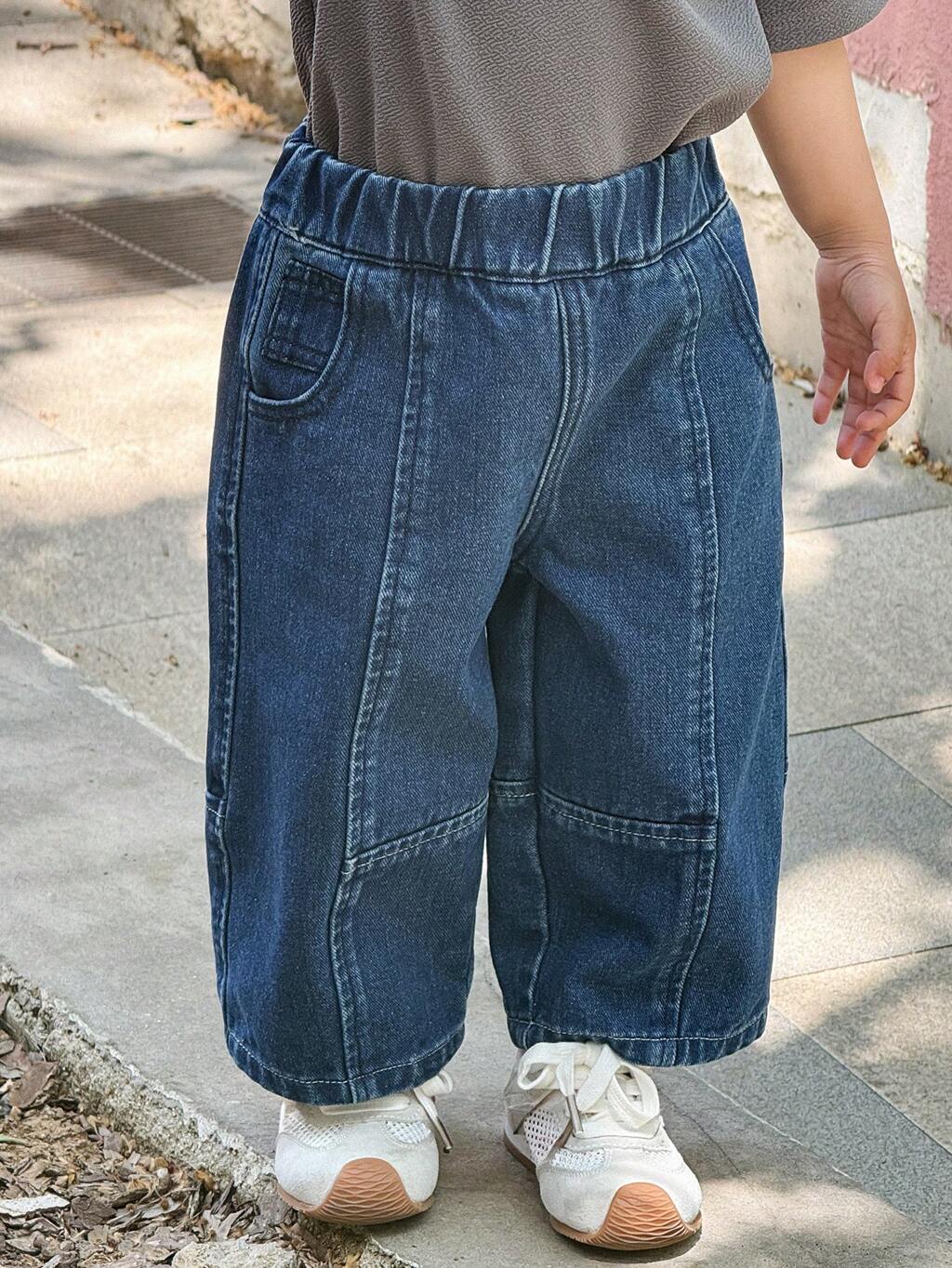 Pantaloni di jeans casual da bambino con lavaggio effetto patchwork, gamba dritta morbida, abbigliamento autunnale per bambini