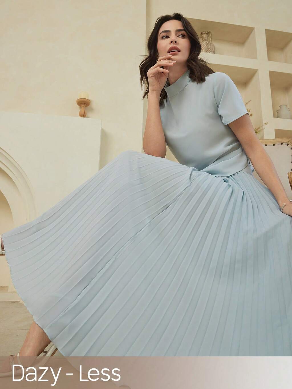 Set elegante di top blu e gonna plissettata, adatto per primavera/estate, look casual/da lavoro, ideale per appuntamenti, matrimoni, pendolarismo