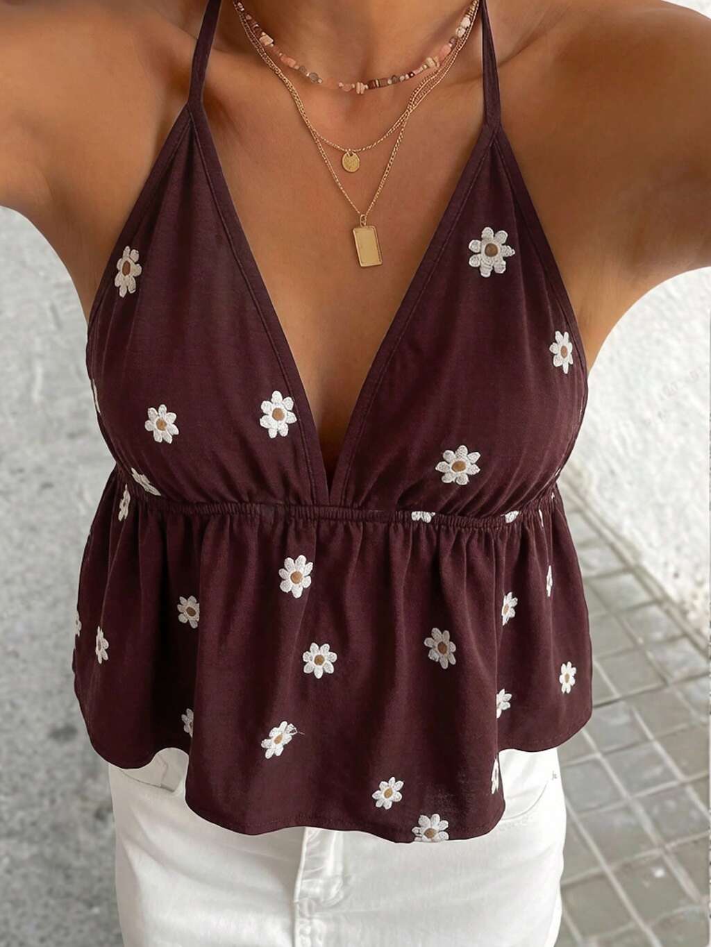 Canotta casual da donna con stampa floreale ricamata all-over, senza maniche con spalline sottili, stile bohémien, adatta per le vacanze estive