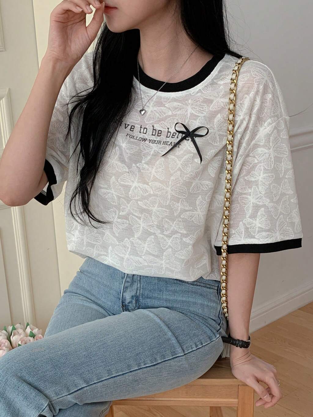 Nuova maglietta larga e casual per donna, con stampa di lettere e decorazione a fiocco, in tessuto grintoso, per la primavera