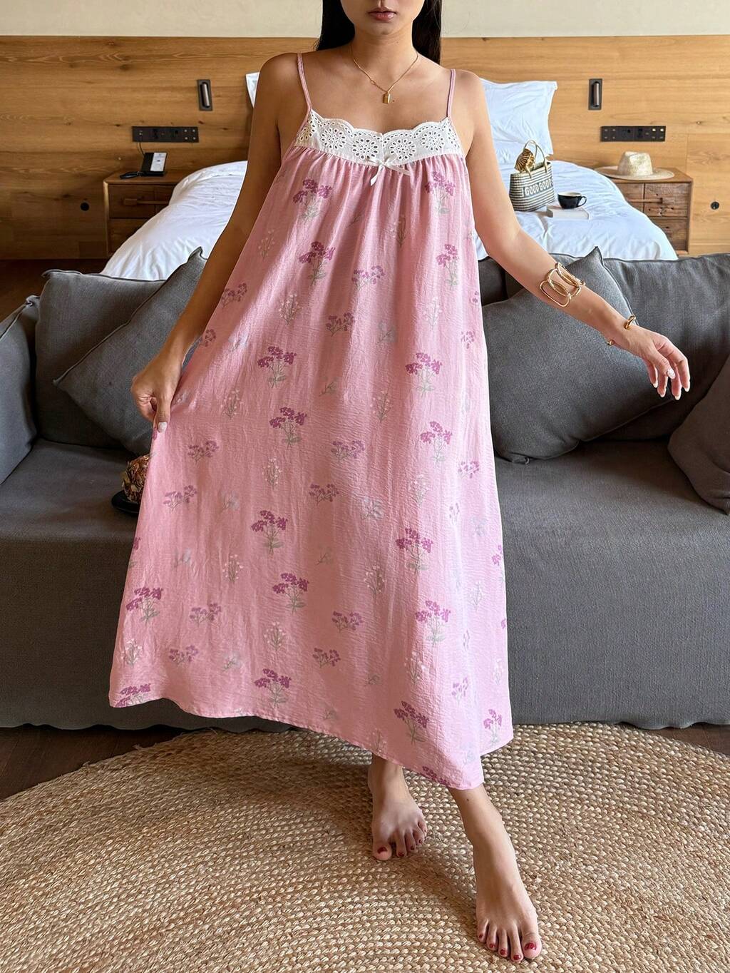 Camicia da notte da donna con stampa floreale e bordo a patchwork