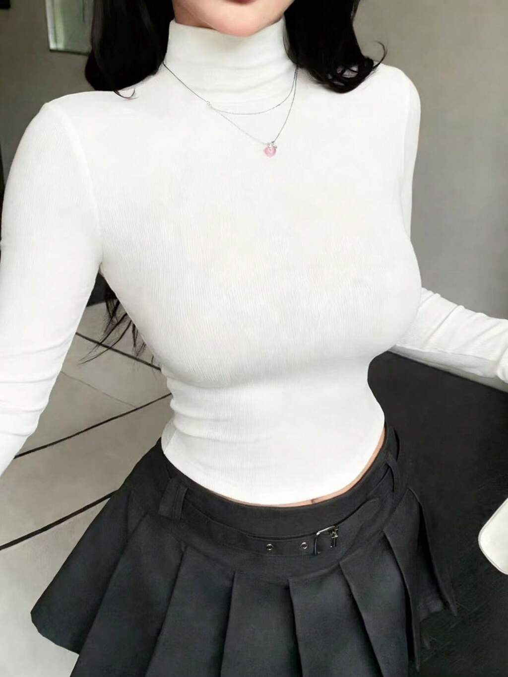 Canotta a collo alto a maniche lunghe aderente di colore unito, minimalista, adatta per uso quotidiano
